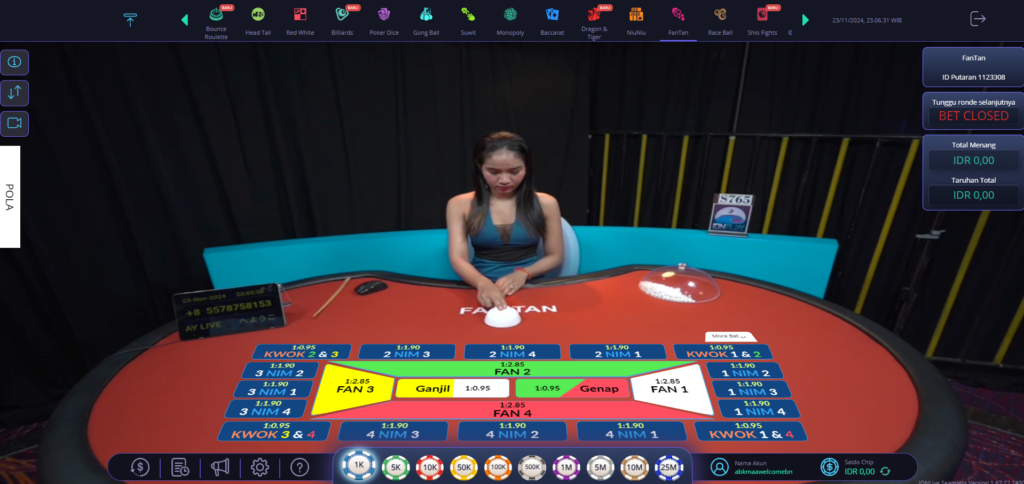 Setelah memiliki akun, log in ke IDN Live dan pilih permainan FANTAN. Biasanya, ada beberapa meja yang bisa dipilih, dengan berbagai batas taruhan. Pastikan untuk memilih meja yang sesuai dengan anggaran kamu.